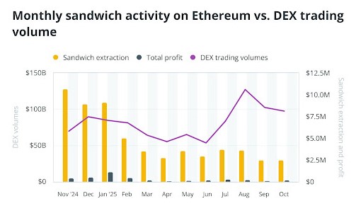 В 2025 году активность децентрализованных бирж на Ethereum заметно выросла: ежемесячный объем торгов поднялся с $65 до более чем $100 млрд. Но на фоне этого роста одна из основных угроз сети — «сэндвич-атаки» — стала приносить злоумышленникам намного меньше дохода.