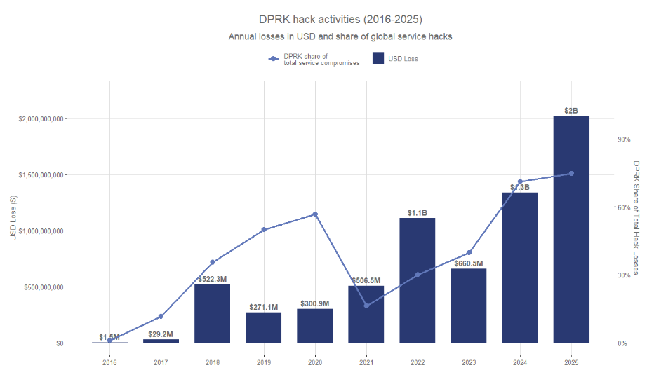 В 2025 году группы хакеров из КНДР похитили $2,02 млрд в криптовалюте — на $681 млн больше, чем в 2024 году.