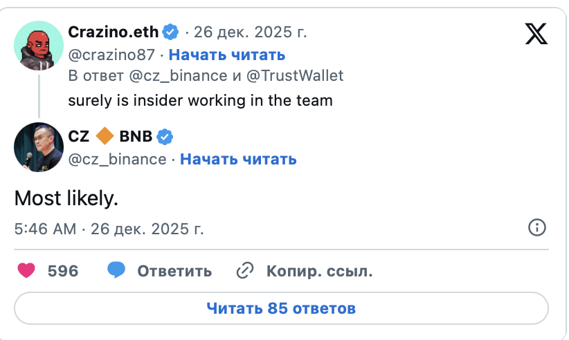 Ситуация вокруг компрометации браузерного расширения Trust Wallet обострилась 26 декабря. Основатель Binance Чанпэн Чжао (CZ) публично прокомментировал инцидент. По его мнению, к нарушению безопасности, вероятно, причастен инсайдер.