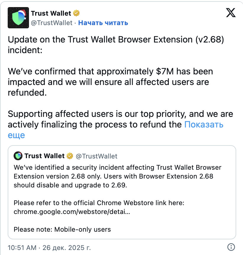 Вскоре после этого команда Trust Wallet уточнила технические детали. Проблема затронула исключительно версию браузерного расширения 2.68. Мобильные приложения и другие версии программного обеспечения не пострадали.