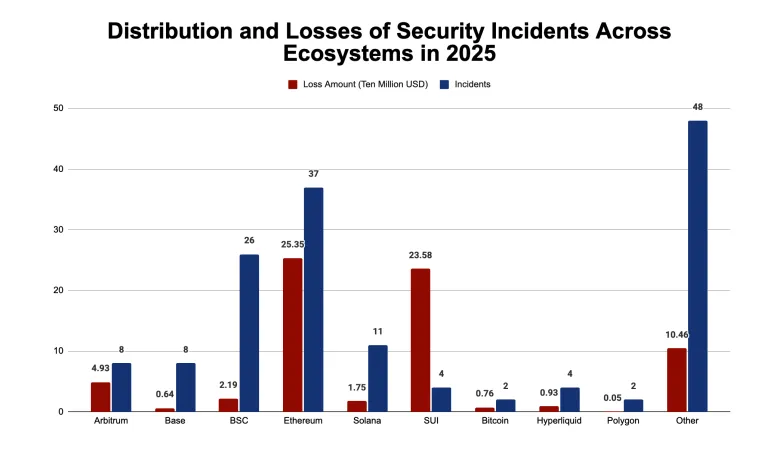 Самой атакуемой экосистемой остался Ethereum ($183 млн потерь). Следом идут Solana и Arbitrum с ущербом около $17 млн в каждой сети.