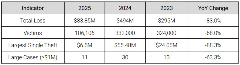 Объем похищенных через фишинговые атаки средств сократился на 83%, составив $83,85 млн в 2025 году. Об этом говорится в отчете SlowMist.