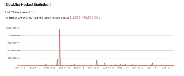 Несмотря на спад активности фишинговых дрейнеров, общий ущерб криптоиндустрии значительно вырос в 2025 году. Аналитики SlowMist зафиксировали 200 инцидентов безопасности с суммарными потерями в $2,935 млрд.
