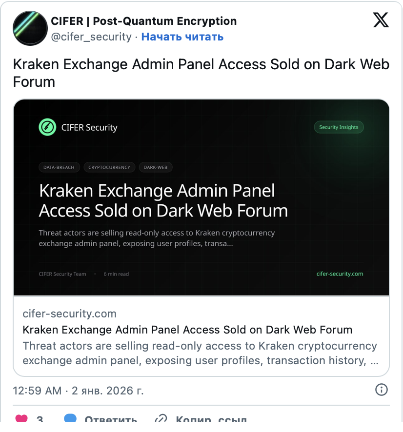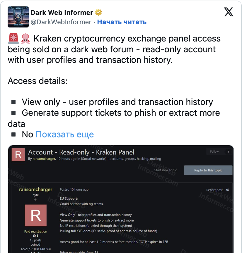 На специализированных форумах в теневом сегменте интернета появилась информация о продаже прав доступа к внутренней административной панели биржи Kraken. Продавец утверждает, что предлагает возможность работы в режиме «только чтение».