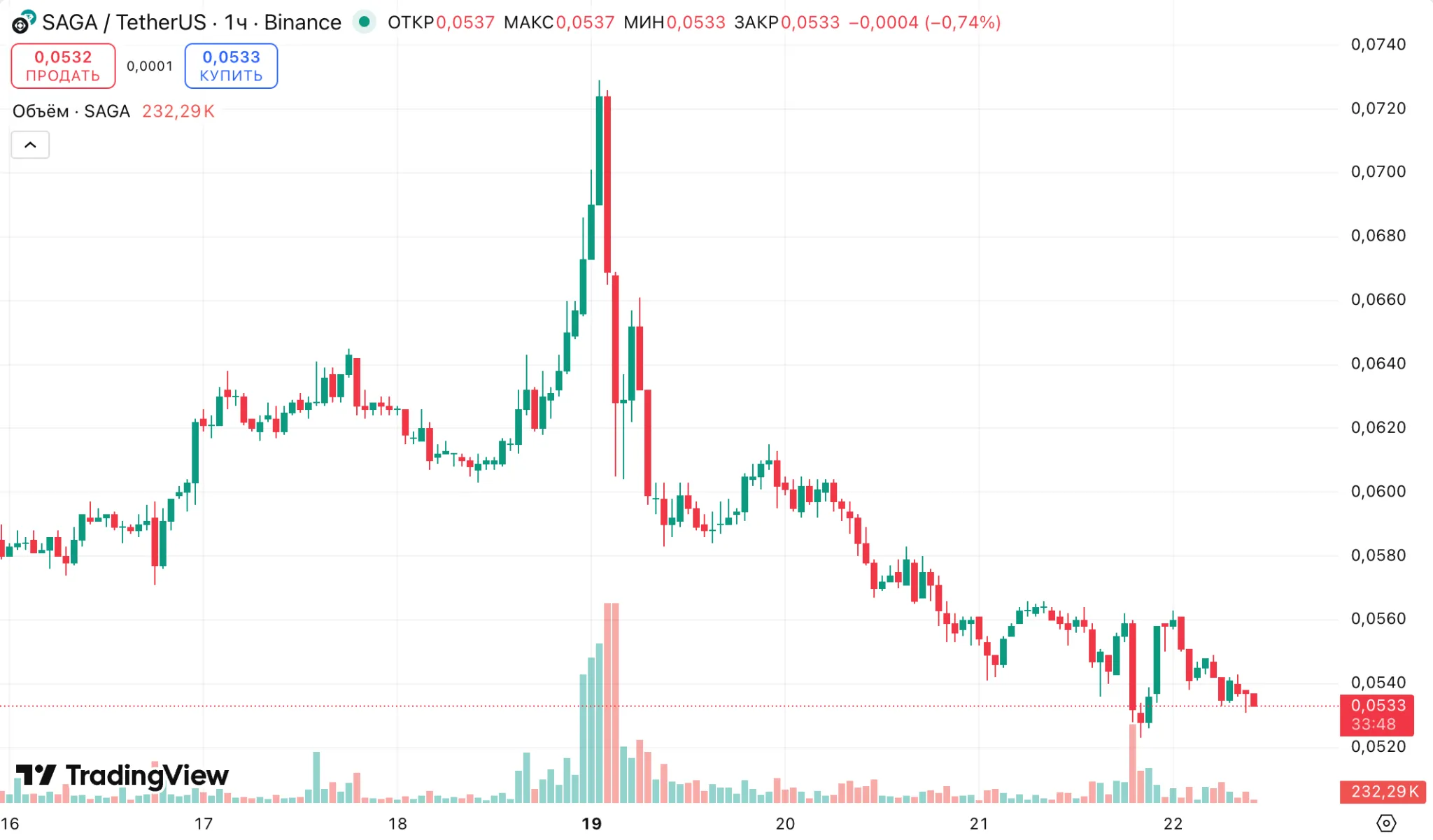 На фоне взлома цена монеты SAGA снизилась на 5,2% — до $0,05.