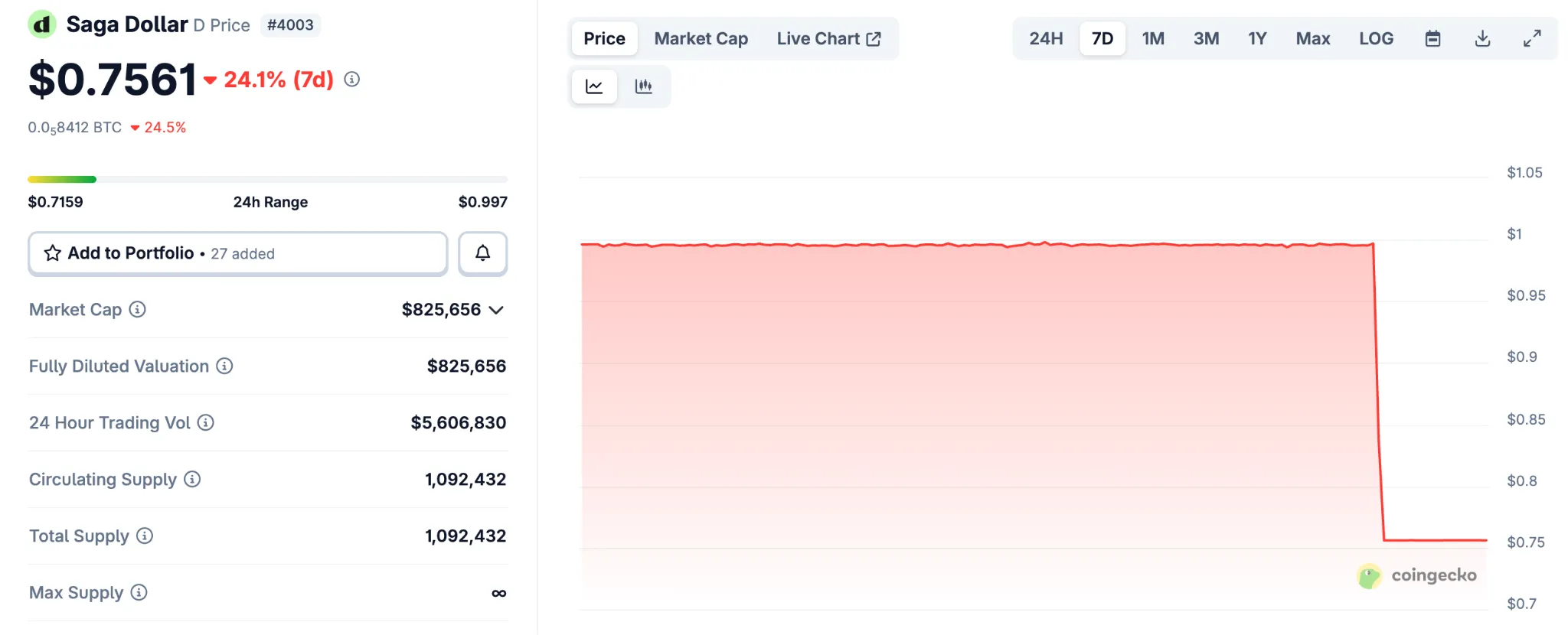 Еще один привязанный к доллару актив проекта под тикером D тоже испытал депег, опустившись до $0,7.