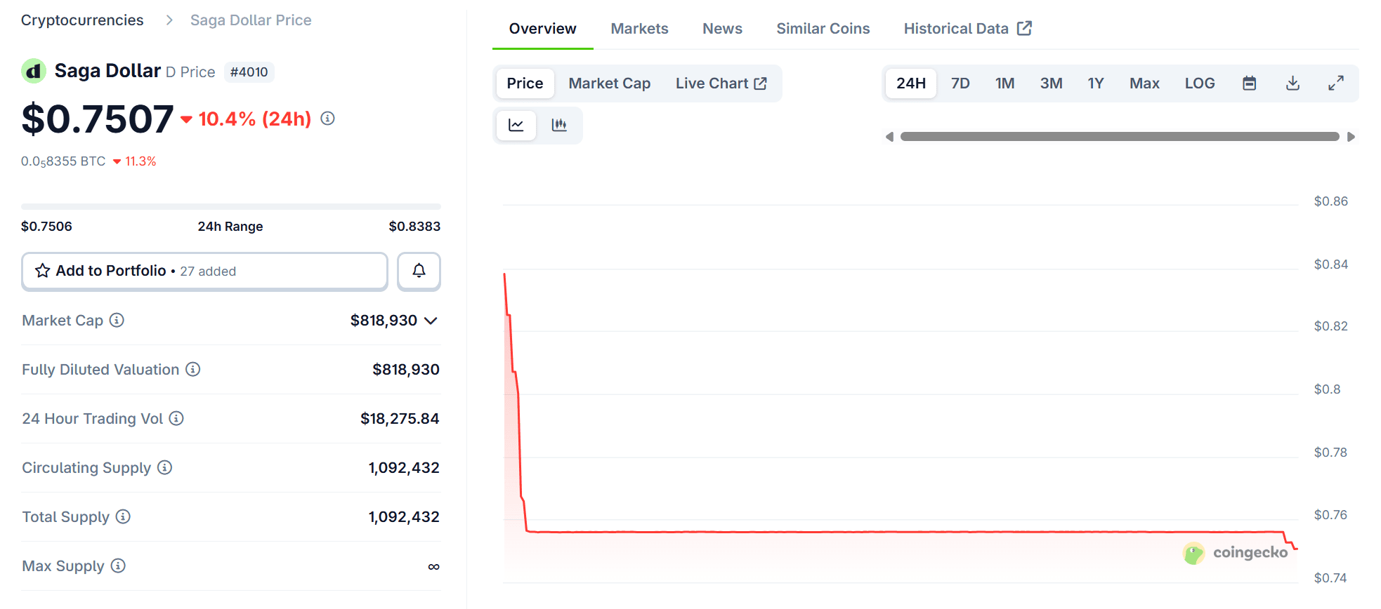 На фоне инцидента основной стейблкоин протокола Saga Dollar (DUSD), привязанный к доллару США, временно потерял привязку. По данным CoinGecko, его курс опускался до $0,75.