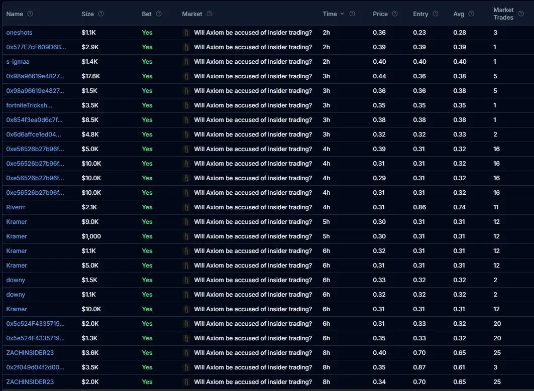 ZachXBT признал в социальных сетях, что связывался с Axiom для получения комментариев и провел несколько интервью перед публикацией, из‑за чего утечка стала «вероятно неизбежной». Это означает, что несколько человек в компании знали о готовящемся отчете до его публикации. Любой из них мог сделать ставки напрямую или сообщить кому‑то, кто это сделал.