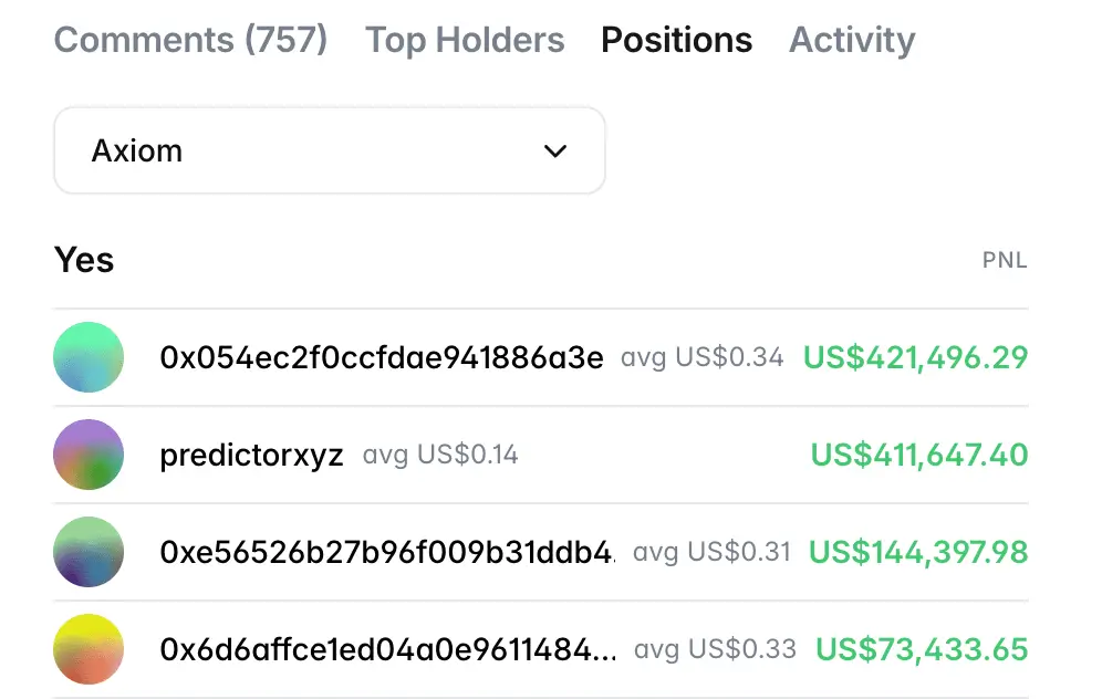 Данные блокчейна раскрывают полную картину. Крупнейший держатель позиций «да» на рынке Axiom — аккаунт под названием predictorxyz — приобрел 477 415 акций по средней цене $0,14 и теперь имеет прибыль в размере $411 000. Это примерно семикратная доходность от ставки, сделанной до обнародования ответа. Второй по величине держатель — анонимный кошелек — купил 109 450 акций по цене $0,33. Концентрация заметна: это не широкий рынок, полный обоснованных предположений, а горстка кошельков доминировала в сегменте ставок на Axiom.