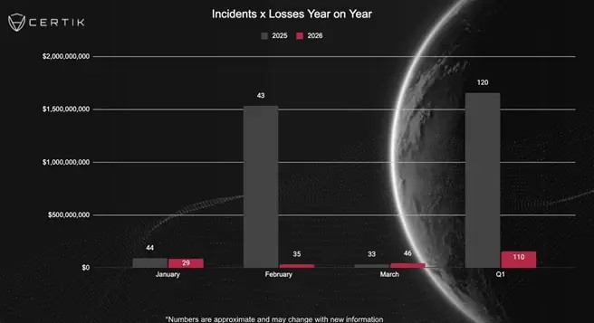 По предварительным оценкам CertiK, за первый квартал 2026 года крипторынок потерял около $501 млн в результате 145 инцидентов. После снижения активности в третьем квартале 2025 года число атак начало расти в конце года и продолжило увеличиваться в начале 2026-го.