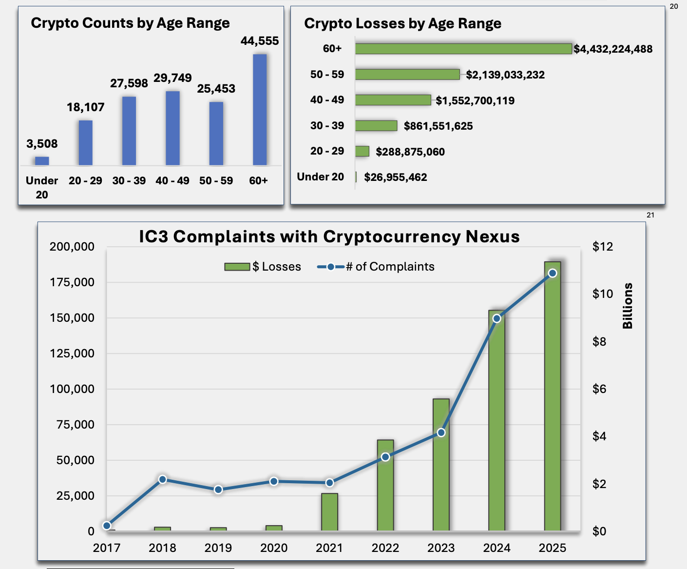 Согласно последнему отчету о киберпреступности, ФБР выявило рост убытков от криптовалютного мошенничества. Центр жалоб на преступления в интернете (IC3) зафиксировал кражу $11,366 млрд в 2025 году. Этот показатель превышает данные предыдущего года на 22%.