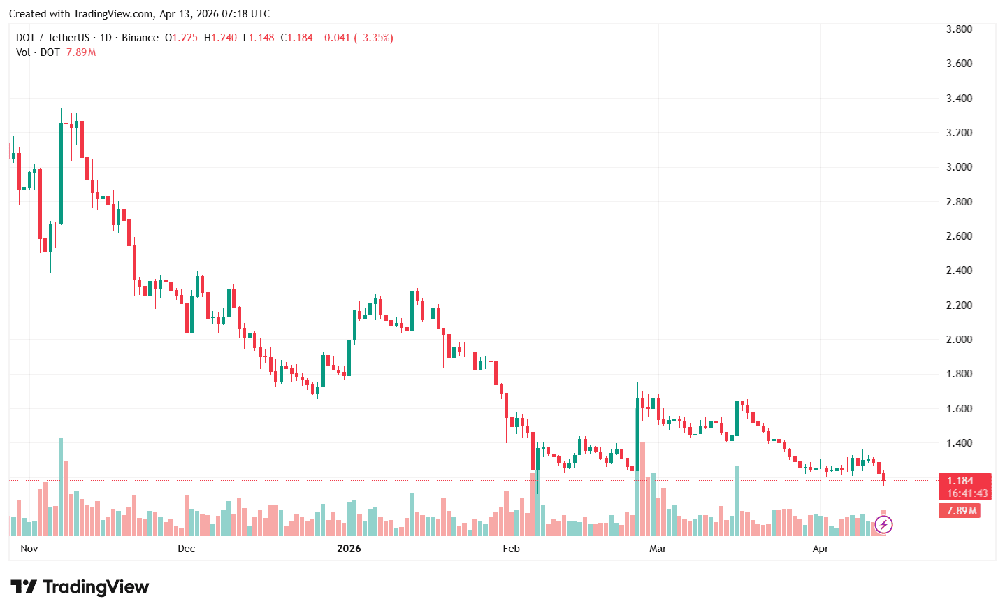 Утром 13 апреля 2026 года курс Polkadot ($DOT) упал на более чем 3% — с $1,22 до $1,15 в моменте, согласно TradingView. Это произошло на фоне сообщений о взломе моста Hyperbridge.