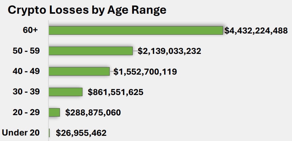 Наибольшие потери зафиксированы среди пользователей в возрасте старше 60 лет — около $4,4 млрд. Для сравнения: группа 50-59 лет потеряла около $2,1 млрд, а 40-49 лет — более $1,5 млрд. В отчете отмечено, что мошенники используют сложные сценарии социальной инженерии, ориентированные именно на старшую аудиторию.