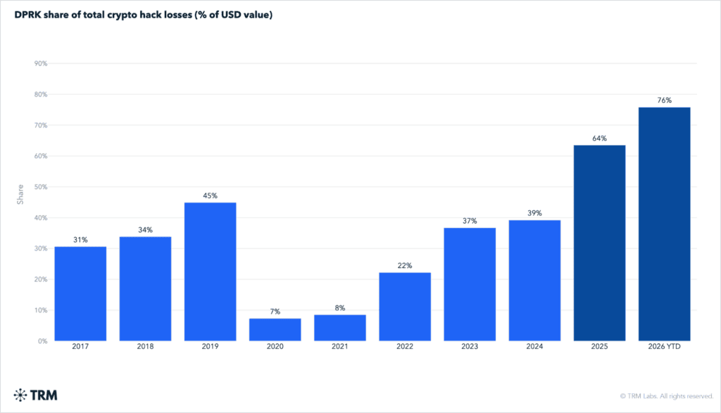 Аналитики подчеркнули, что доля Северной Кореи в криптокражах продолжает расти. С менее чем 10% в период с 2020 по 2021 год до 64% в 2025, и 76% в 2026 году.