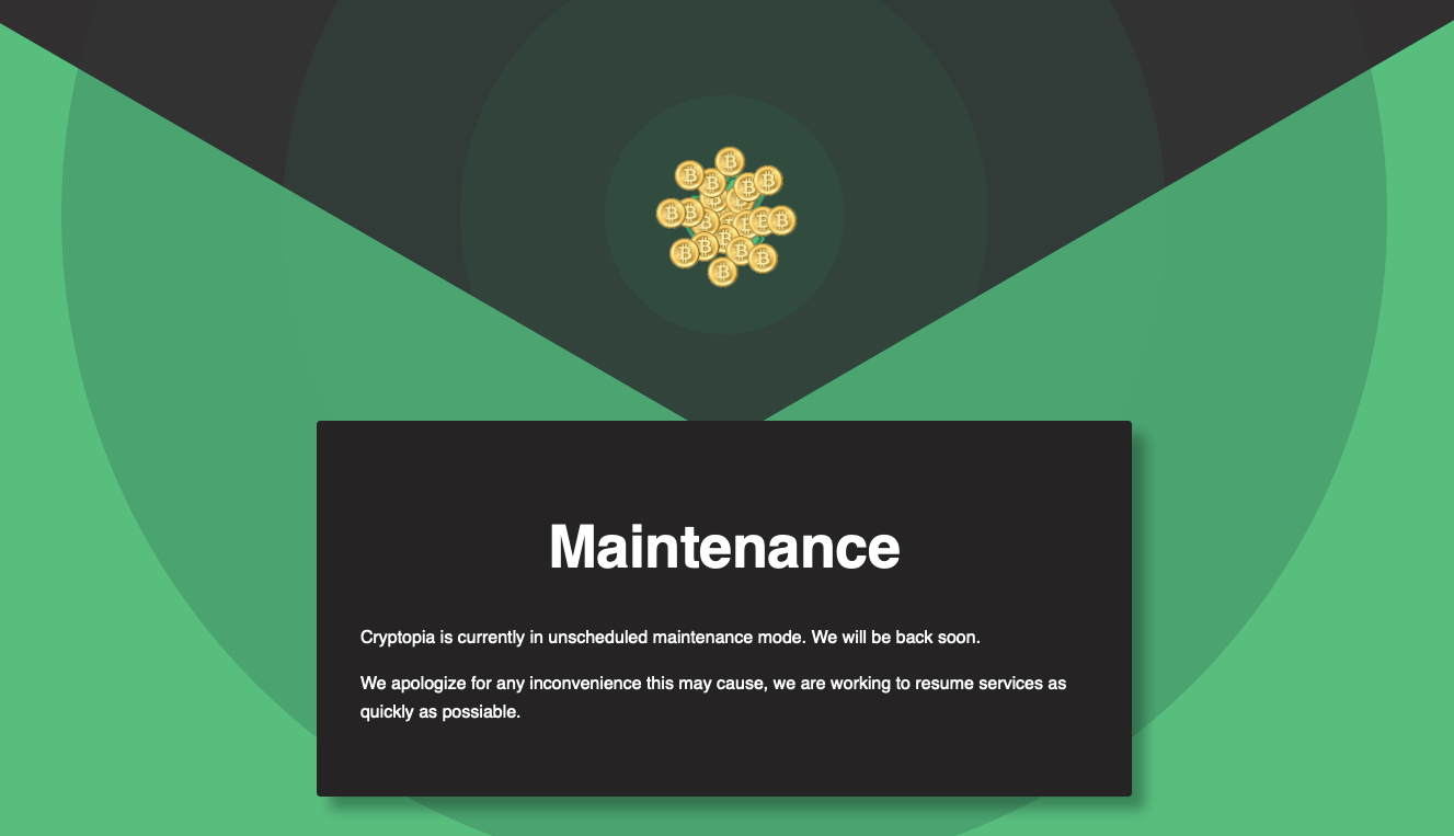Надпись гласит, что в данный момент Криптопия находится в режиме внепланового обслуживания. Представители команды извиняются за неудобства и обещают вернуться в эфир как можно скорее. Согласно их заявлению, разработчики усердно трудятся над восстановлением работоспособности. Причём работа кипит настолько сильно, что ребята даже не заметили опечатку в последнем слове.