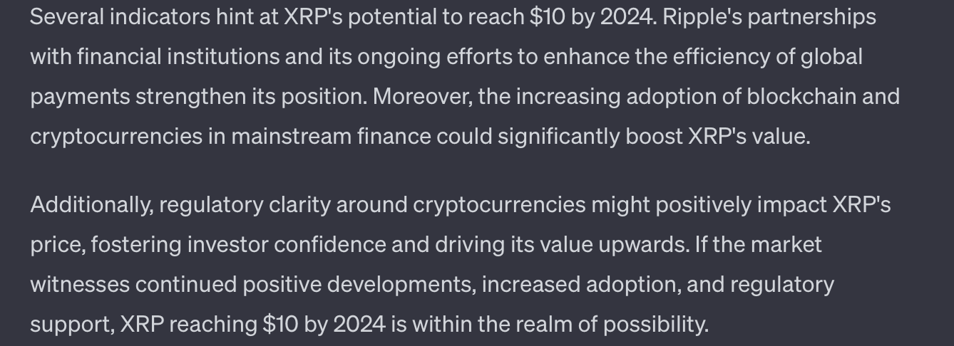 بالإضافة إلى ذلك، يمكن أن يكون للوضوح التنظيمي حول العملات المشفرة تأثير إيجابي على سعر XRP من خلال تعزيز ثقة المستثمرين وزيادة قيمته. إذا استمر السوق في رؤية تطورات إيجابية، وزيادة التبني والدعم التنظيمي، فإن الوصول إلى 10 دولارات لـXRP بحلول عام 2024 يبدو أمرًا صعبًا للغاية، ولكنه ليس مستحيلًا.