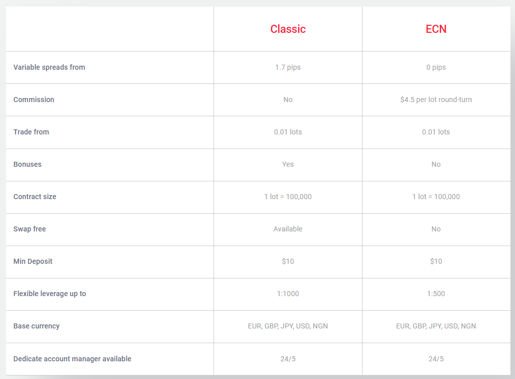 FXCess bietet zwei Hauptkonten sowie ein Demokonto an. Beide Konten erfordern eine Mindesteinlage von 10 $, haben eine Mindestpositionsgröße von 0,01 Lots und sind mit den Basiswährungen EUR, GBP, JPY, USD und NGN handelbar.