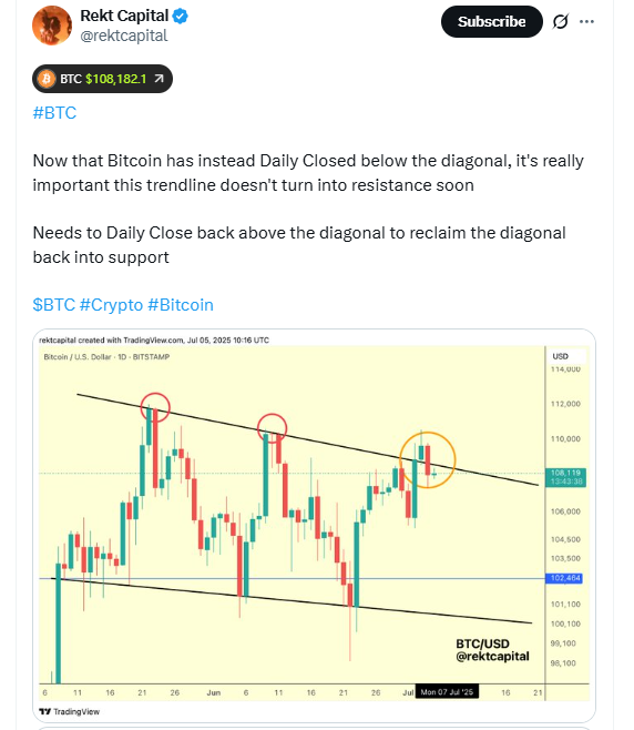 Analyst Rekt Capital schreibt, dass BTC zuerst eine wöchentliche Kerze über 109.000 Dollar (die rote Linie) schließen muss.
