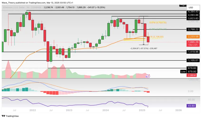 Damit könnte Ethereum zur nächsten Unterstützungszone zwischen rund 1.105 USD und 1.420 USD korrigieren. Dort angekommen, könnte Ethereum bullisch abprallen.