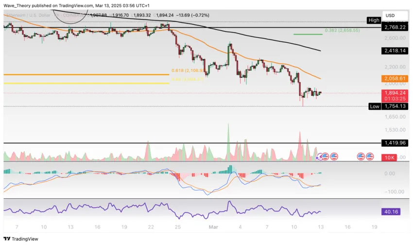 Ethereum-Prognose für Donnerstag, 13. März 2025: Der Ethereum Kurs scheint jetzt bärisch auszubrechen. Damit könnte er eine Etage tiefer fallen.