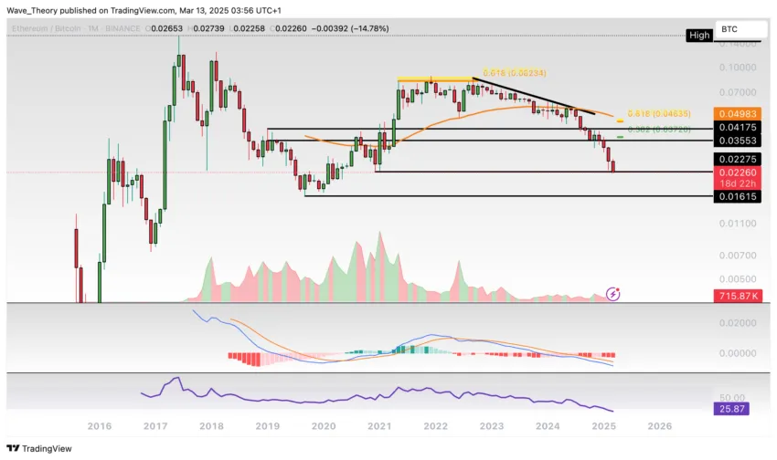 Dann warten bei rund 0,0372 BTC und bei rund 0,0463 BTC die nächsten signifikanten Fibonacci Widerstände. Die Indikatoren zeigen sich dabei bärisch im Monatschart.