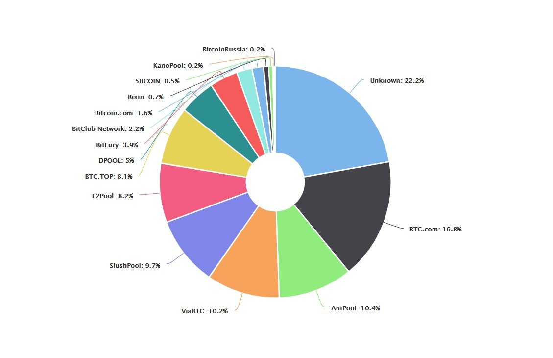 According to the latest statistics, more than 70% of the hash power is controlled by the top 7 largest individual miners, which indicates a significant degree of centralization, becoming dangerous for the existence of the entire network. Thus, the share of BTC.com accounts for about 16.8% of the hash rate yet, Antpool - 10.4%, ViaBTC - 10,2%, SlushPool - 9.7%, F2Pool is 8.2% and almost the same share has BTC.TOP. At the same time, the unknown pool, as we can see, concentrated more than 22% of all capacity.