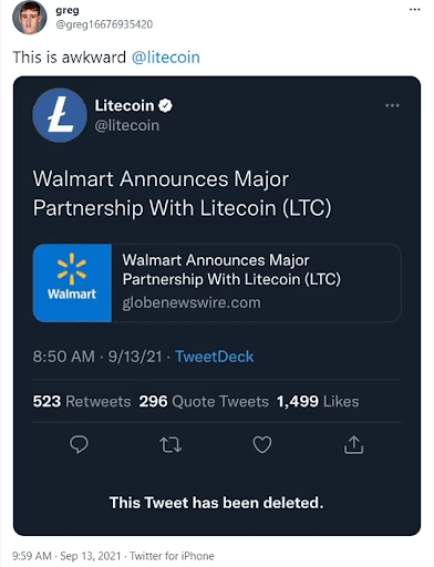 Еven the manager responsible for Litecoin’s social networks, stunned by the “achievement” of his company, hastened to retweet the message about the partnership with Walmart in the official account, without bothering to check this information with the higher management.