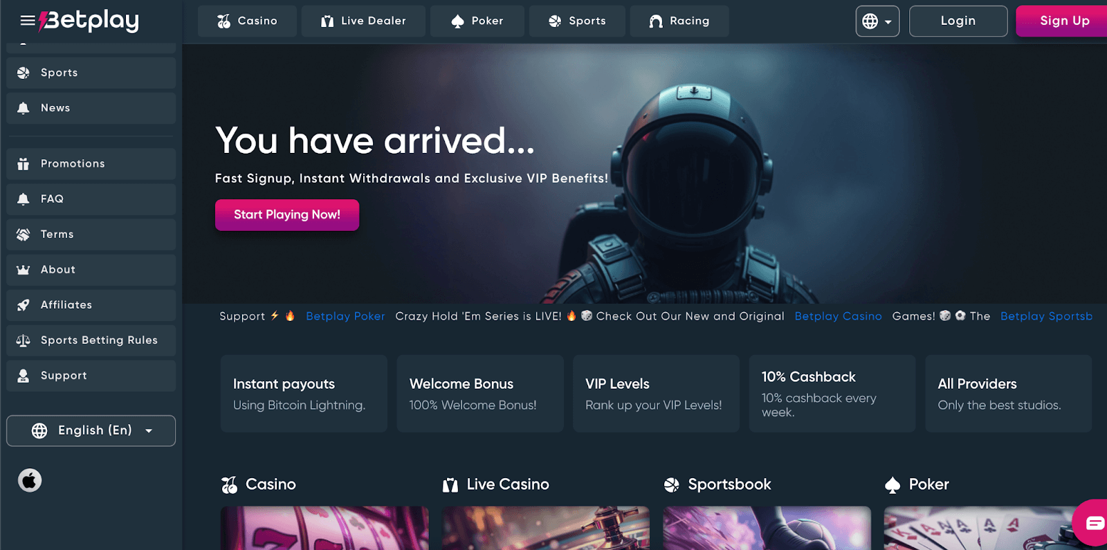 The Bitcoin casino saw the light of day in 2020 and positioned itself as a blockchain gaming platform and bookmaker in one pack. Today, the gambling provider has accumulated over 6,000 titles in the gaming lobby, while the slot share reaches over 90%. The platform also covers live dealer games and classic table games powered by the well-known Microgaming and NetEnt.