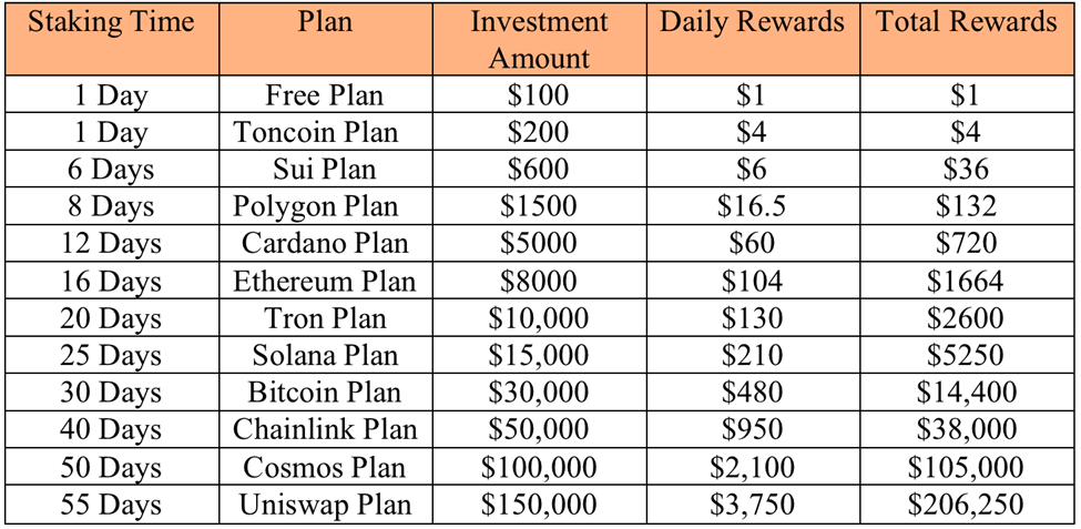 There are different staking plans in the CryptoHeap. With the money you have in your account, you can follow various investment options that are available on the CryptoHeap store. The platform provides you information on the rewards you received staking duration and the risks associated with it.