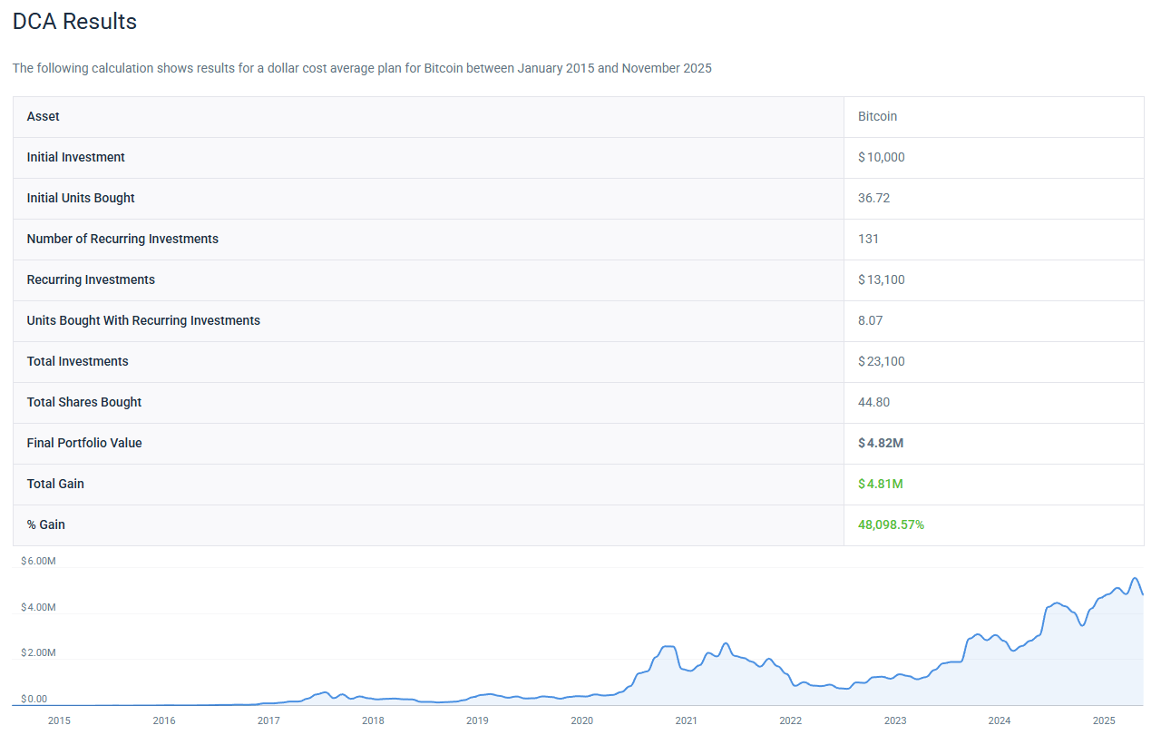 Results of a DCA plan that started with $1,000 in 2015 and continued with $100 monthly payments up to 2025.