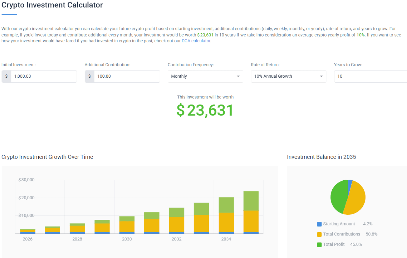 The CoinCodex DCA calculator shows how this strategy performs across different time periods. It calculates your average entry price, the total Bitcoin accumulated, takes into account your recurring monthly payments, and calculates the ROI you would have achieved. Using the DCA calculator alongside the profit calculator allows you to compare the DCA strategy to a single one-time investment, which can be helpful when planning long-term exposure.