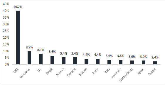 Among the countries analyzed, these are the leaders in terms of the queries containing the word "bitcoin": the USA is on top with more than 40% of the total number of queries analyzed. The lowest demand comes from the Netherlands (3%), Spain (3%) and Russia (2.4%).