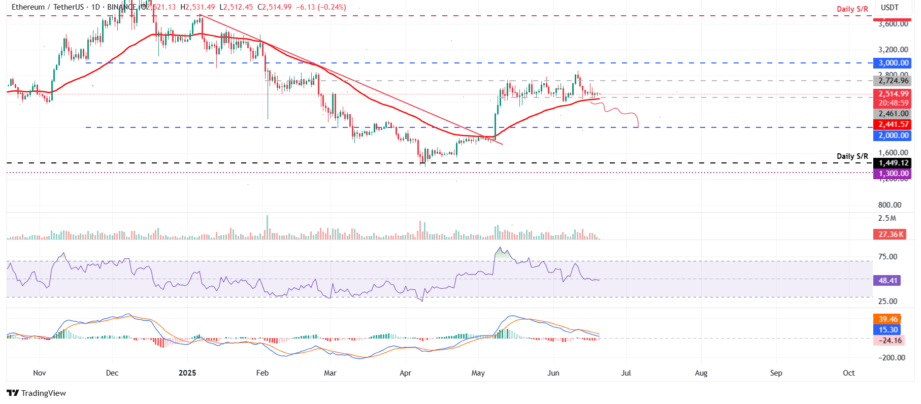 El precio de Ethereum volvió a probar y encontró soporte alrededor de su EMA de 50 días en 2.441$ el miércoles, consolidándose en este nivel al día siguiente. Este nivel coincide con el límite inferior de consolidación de 2.461$, convirtiéndolo en una zona de soporte clave. Al momento de escribir el viernes, se mantiene alrededor de 2.514$.