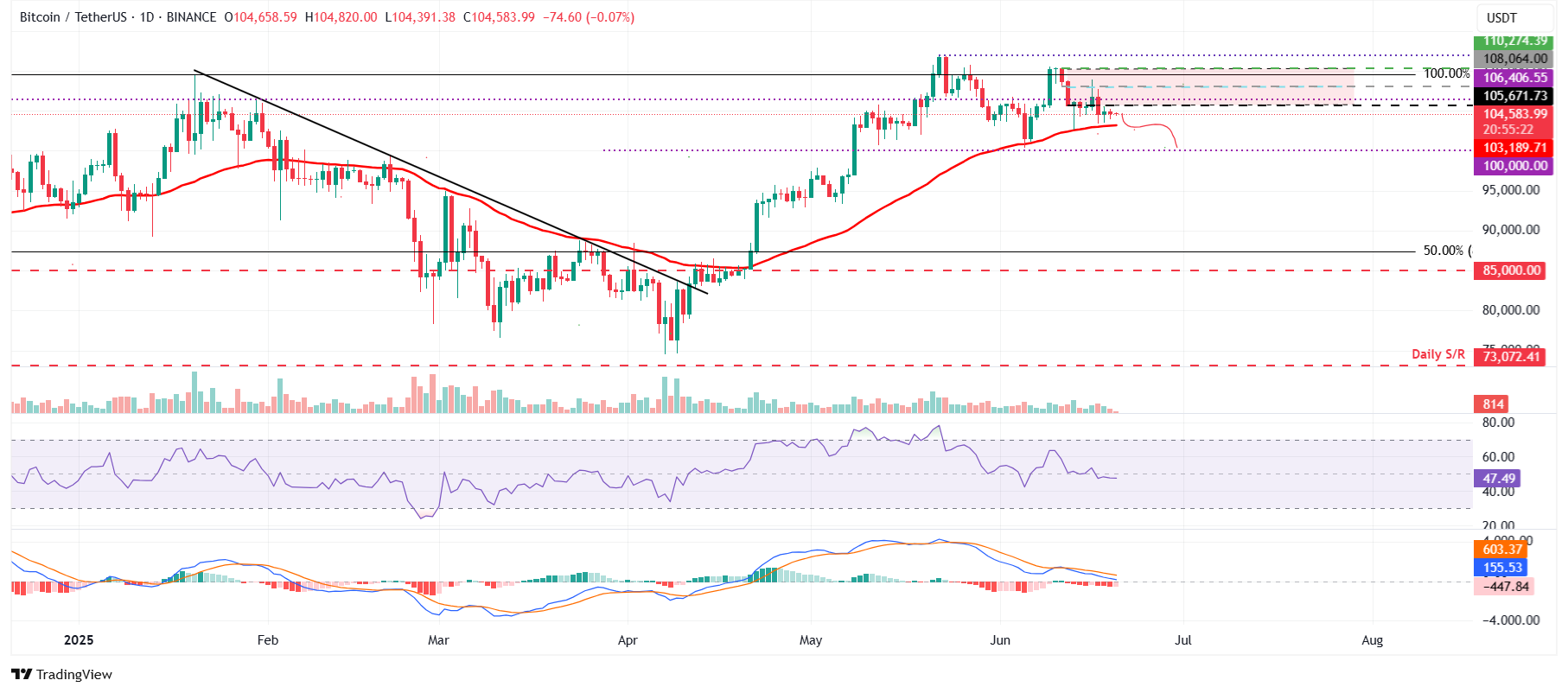 Si BTC continúa su corrección y cierra por debajo de la EMA de 50 días en 103.100$ de manera diaria, podría extender la caída para volver a probar su nivel clave psicológicamente importante en 100.000$.