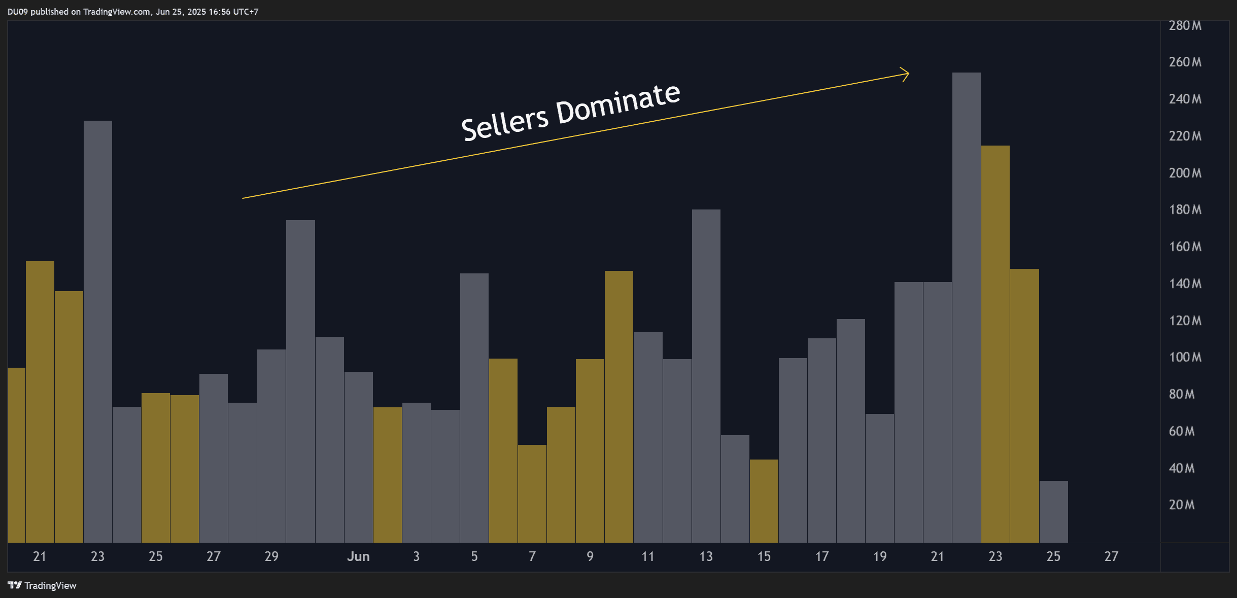 El volumen diario refleja máximos crecientes por parte de los vendedores, lo que les da el control del movimiento del mercado. Los rebotes han sido breves y parecen responder más bien al cierre de posiciones cortas, lo que implica compras forzadas por parte de los bajistas. Para empeorar el panorama, el domingo ADA marcó un nuevo mínimo descendente, una señal clara de continuación bajista.