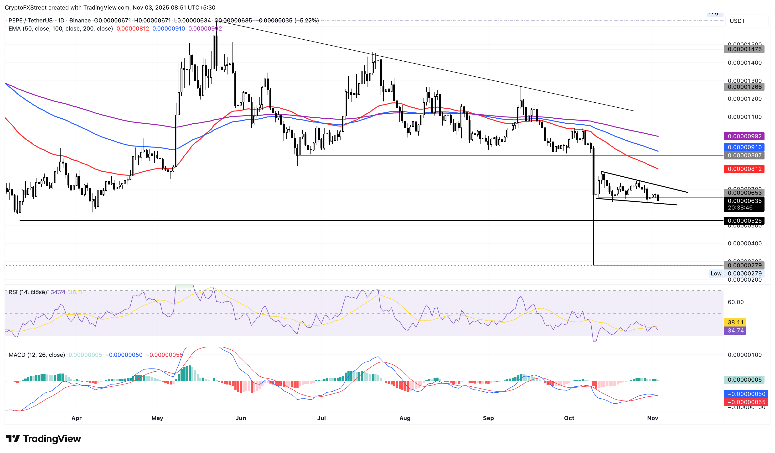 Pepe baja un 5% en el momento de la redacción el lunes a medida que disminuye la demanda minorista y de ballenas. La moneda meme se acerca a una línea de tendencia de soporte local cerca de 0.00000620$, formada al conectar los mínimos del 11 y 30 de octubre.