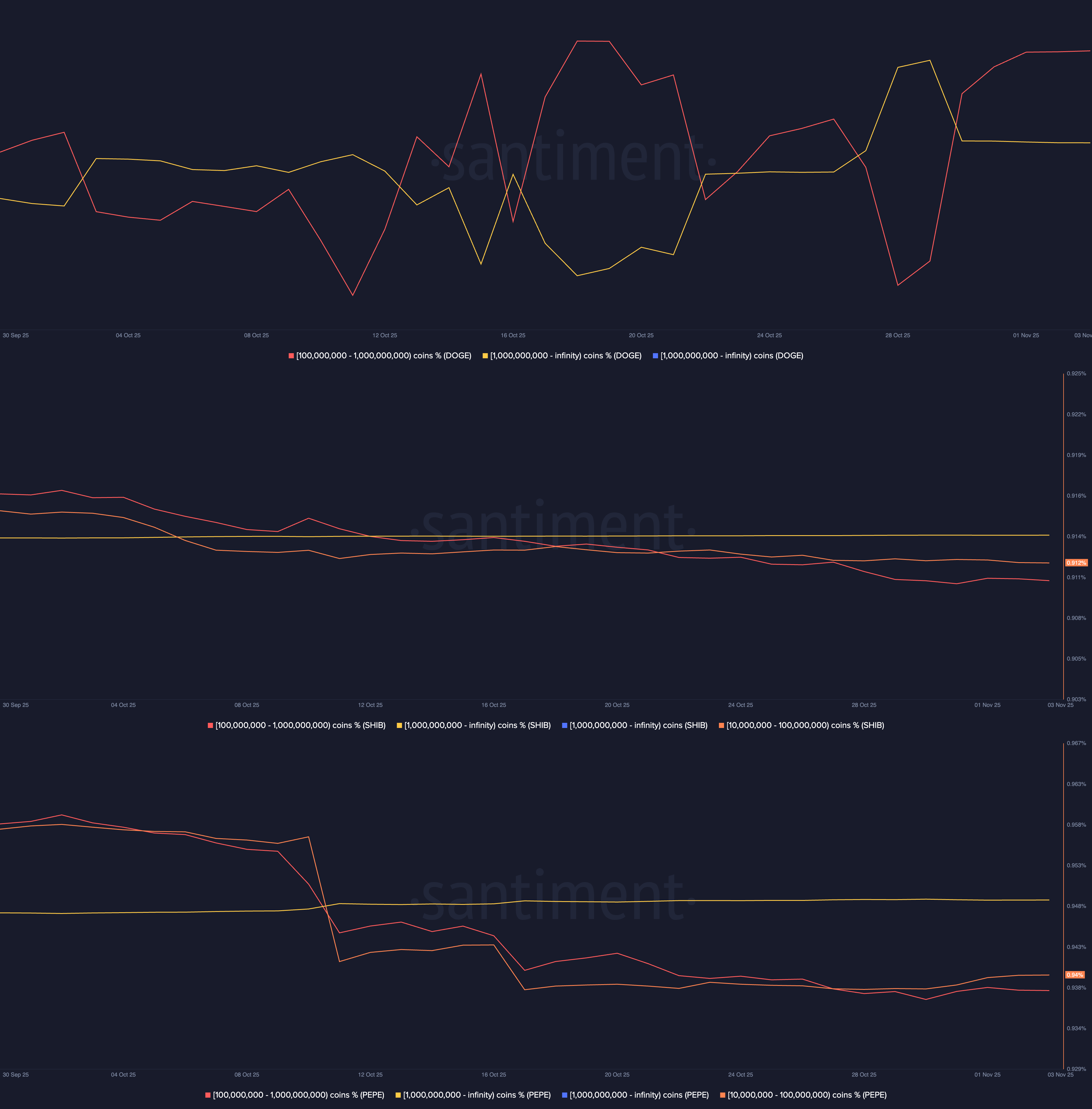 En una nota más negativa, una tendencia a la baja en las tenencias de ballenas de SHIB y PEPE, con entre 100 millones y 1.000 millones de tokens, indica una intensa presión de suministro.