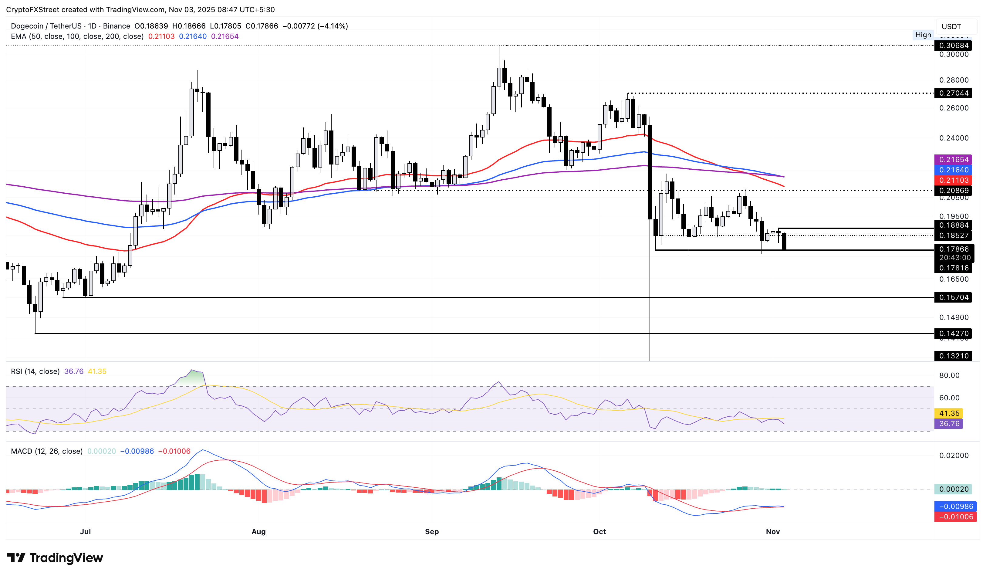 Dogecoin cae más del 4% en el momento de la redacción el lunes, cotizando por debajo del nivel de 0.18000$. Los compradores de DOGE luchan por mantener los precios en caída en el nivel de soporte de 0.17816$, marcado por el mínimo del 11 de octubre.