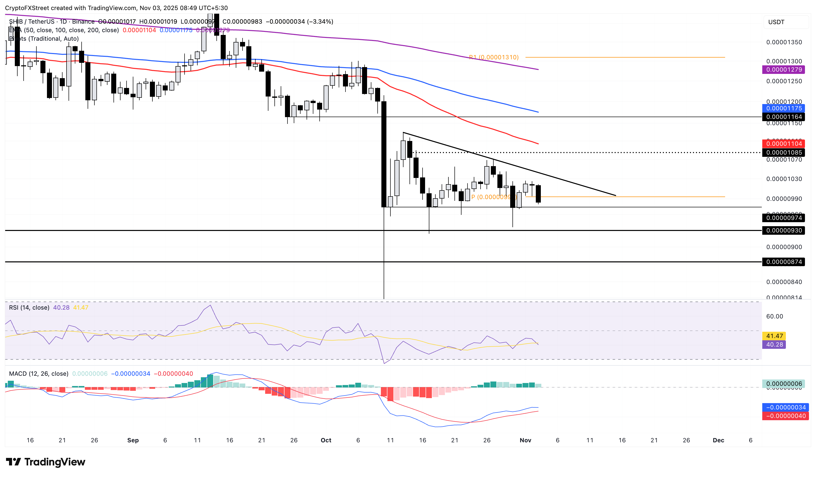 Shiba Inu cae por debajo del nivel psicológico de 0.00001000$, marcando un inicio bajista para la semana. En el momento de escribir, SHIB ha bajado más del 3% el lunes, arriesgando una caída por debajo del nivel de soporte de 0.00000974$, marcado por el cierre del 10 de octubre.