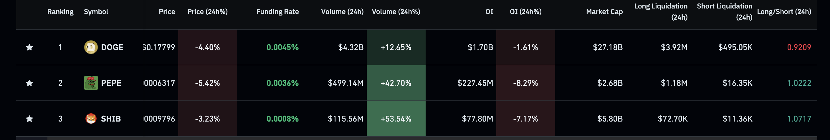 Datos de derivados de monedas meme. Fuente: CoinGlass