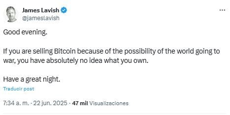 James Lavish compartió su opinión: “Si vendes bitcoin por la posibilidad de una guerra mundial, no tienes ni idea de lo que posees”.