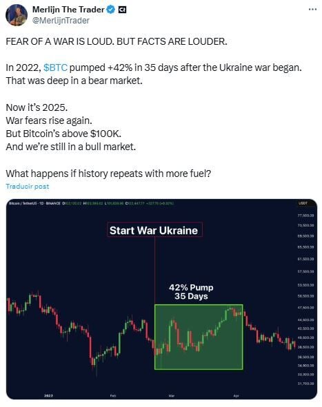 El analista Merlijn The Trader, insistió en que “el miedo a la guerra es fuerte. Pero los hechos son aún más fuertes”. Merlijn añadió: “En 2022, [bitcoin] se disparó un 42% en 35 días tras el inicio de la guerra en Ucrania”. Señaló además que seguimos en un mercado alcista y preguntó: