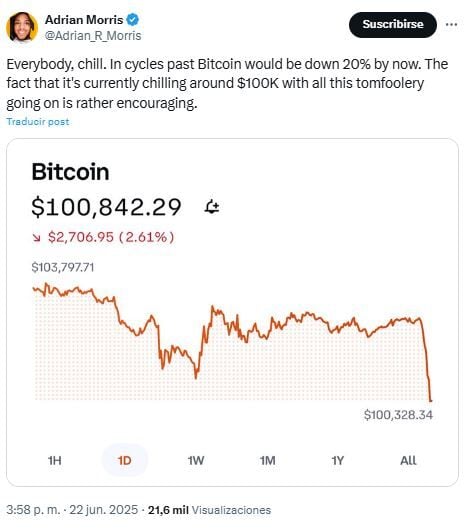 Adrian Morris se dirigió a X con un mensaje tranquilizador: "Tranquilos. En ciclos anteriores, Bitcoin ya habría caído un 20%. El hecho de que actualmente se mantenga en torno a los 100.000 dólares con todas estas tonterías es bastante alentador".
