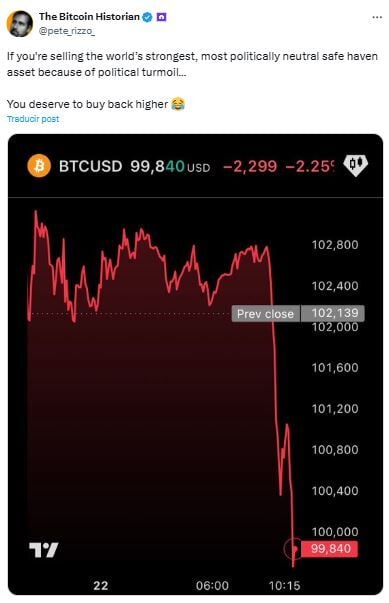 Mientras tanto, Pete Rizzo, el historiador de Bitcoin, no se contuvo: "Si estás vendiendo el activo refugio más fuerte y políticamente neutral del mundo debido a la inestabilidad política, mereces recomprar a un precio más alto".