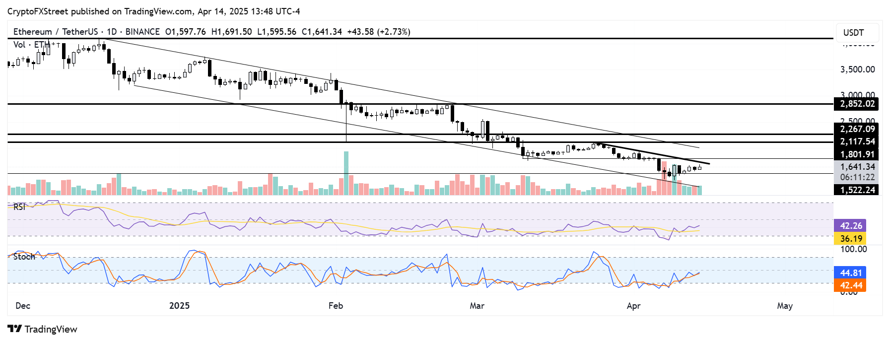 ETH rebotó en el nivel de soporte de 1.522$ el viernes pasado y está a punto de enfrentar una resistencia clave de línea de tendencia descendente que se extiende desde el 25 de marzo. Un fallo en superar la línea de tendencia podría fortalecer su resistencia, lo que podría provocar un aumento de órdenes de venta cada vez que el precio de ETH se acerque a ella. Tal movimiento podría enviar a ETH a probar el soporte de 1.522$.
