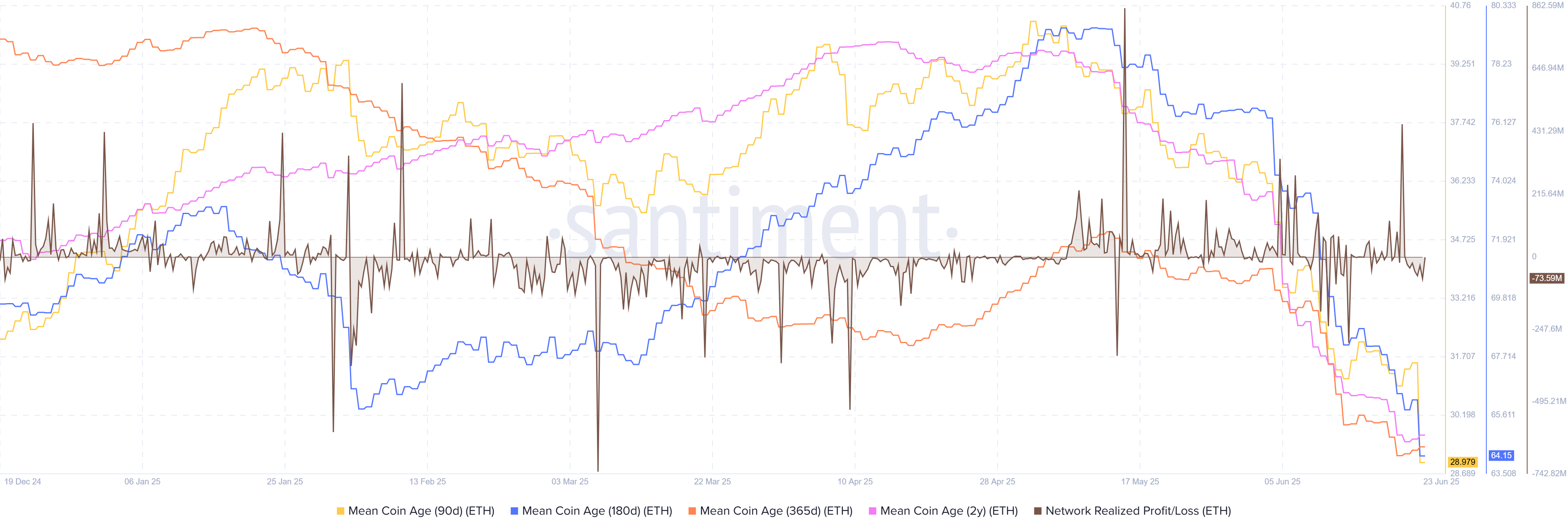Beneficio/Pérdida Realizada de la Red ETH y Edad Media de Monedas. Fuente: Santiment