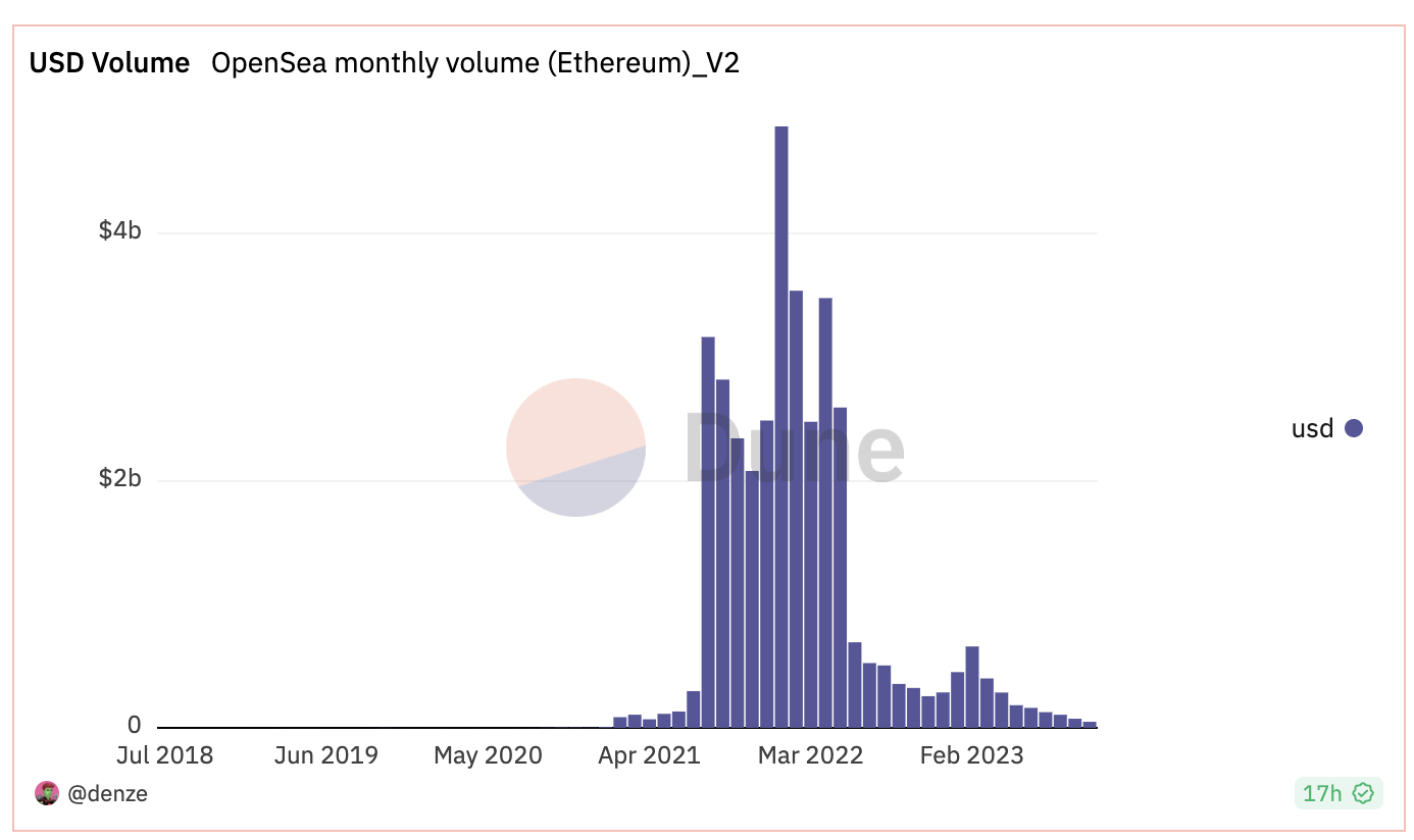 El motivo de la reducción de plantilla parece ser la dura realidad económica. El precipitado descenso del volumen de intercambios, piedra angular del modelo de ingresos de OpenSea, dibuja un turbio panorama financiero. Un cuadro de mando compilado por Dune Analytics ilustra vívidamente este declive: el volumen mensual de intercambio de OpenSea en Ethereum, que representa la gran mayoría de sus transacciones, alcanzó un máximo de 4.870 millones de dólares en enero de 2022, pero se desplomó a sólo 49 millones de dólares en octubre.