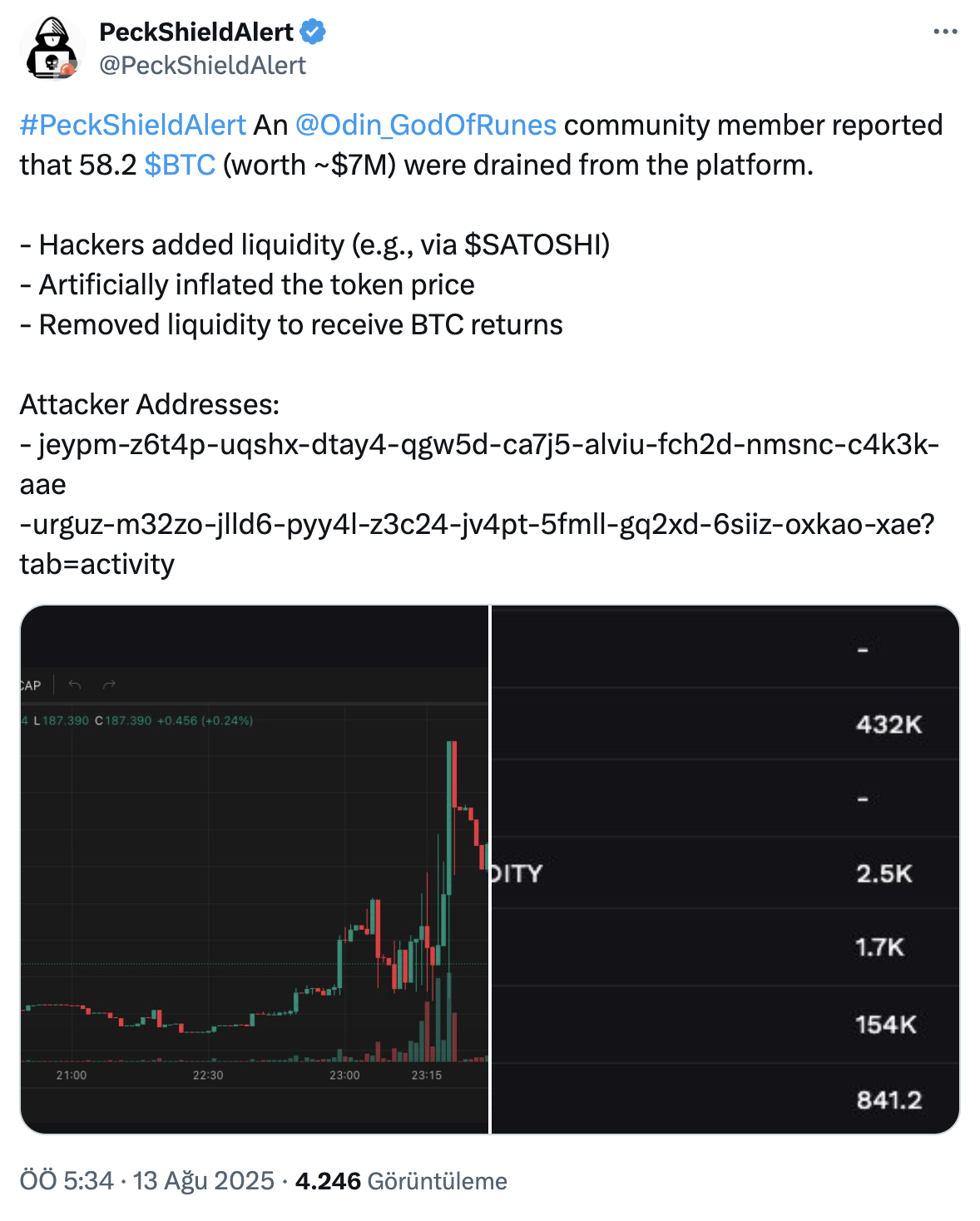 PeckShield confirmó el desvío de 58.2 BTC de Odin.fun, haciendo eco de las advertencias de un miembro de la comunidad, web3xiaoba. Según web3xiaoba, los hackers manipularon la liquidez al agregar monedas que se asemejaban a SATOSHI en los pools de liquidez de la plataforma, inflando sus precios antes de retirar la liquidez para obtener retornos en Bitcoin. Este exploit interrumpió el orden automático del mercado, inclinando el equilibrio a favor de los atacantes y revelando vulnerabilidades dentro del marco del sistema.