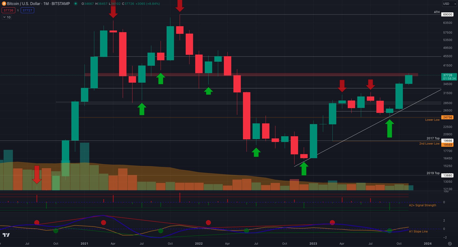 “Monthly candle was excellent with a candle body low of $34.5K, this is important in that the lower candle BODY low was higher then the preceding candle BODY high. This is a sign of strength!” fellow trader and chartist JT continued in part of his own summary.
