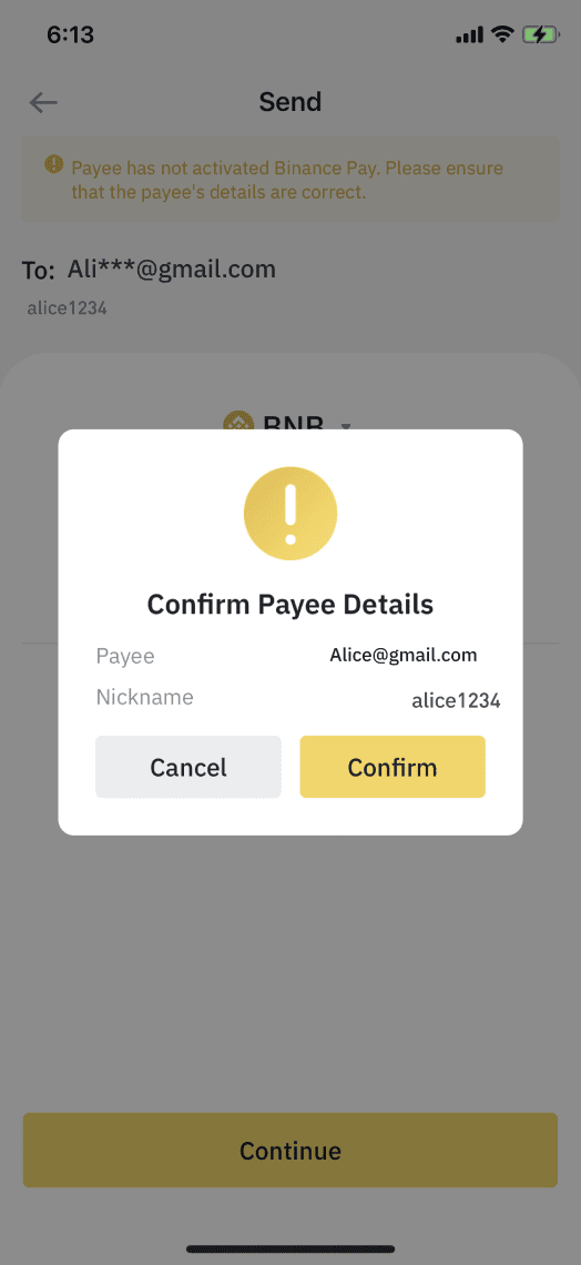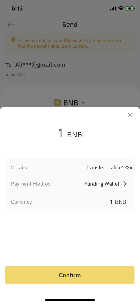 After you select the type and amount of cryptocurrency that you want to send, the Binance Pay platform will ask you to confirm the details of the recipient. Make sure that you have entered the right details. In the example image below, the recipient’s email is used (phone number and Binance Pay ID are also options).